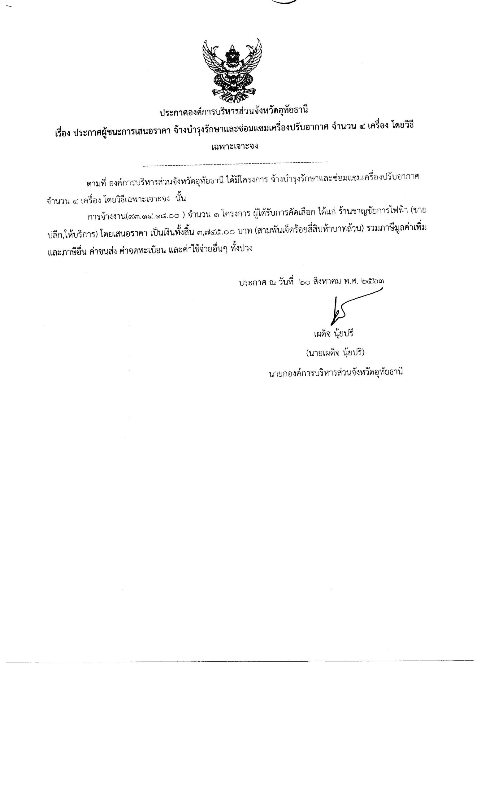 ประกาศองค์การบริหารส่วนจังหวัดอุทัยธานี เรื่อง จ้างบำรุงรักษาและซ่อมแซมเครื่องปรับอากาศ จำนวน 4 เครื่อง โดยวิธีเฉพาะเจาะจง