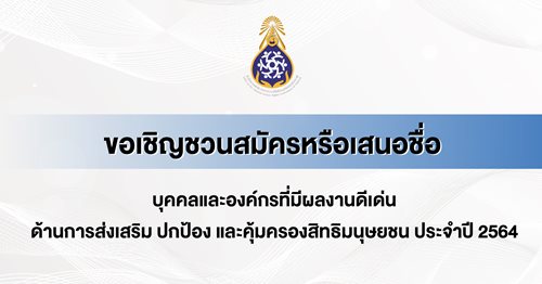 เชิญชวนบุคลากรที่มีความสนใจ สมัครเข้ารับการคัดเลือกเพื่อรับรางวัลบุคคล และองค์กรที่มีผลงานดีเด่นด้านการส่งเสริม ปกป้อง และคุ้มครองสิทธิมนุษยชน ประจำปี 2565 สามารถดาวน์โหลดใบสมัครได้ที่ www.nhrc.or.th ตั้งแต่บัดนี้เป็นต้นไป จนถึงวันที่ 30 กันยายน 2564 และ ส่งใบสมัครทางไปรษณีย์อิเล็กทรอนิกส์ [email protected] ภายในเวลา 24.00 น. ของวันที่ 30 กันยายน 2564