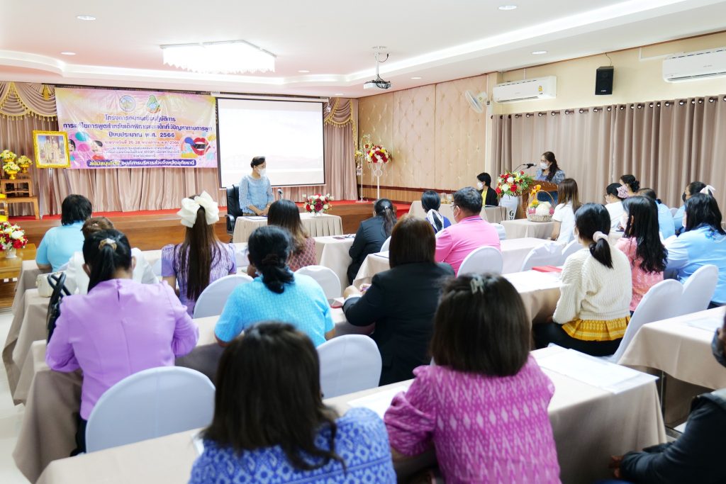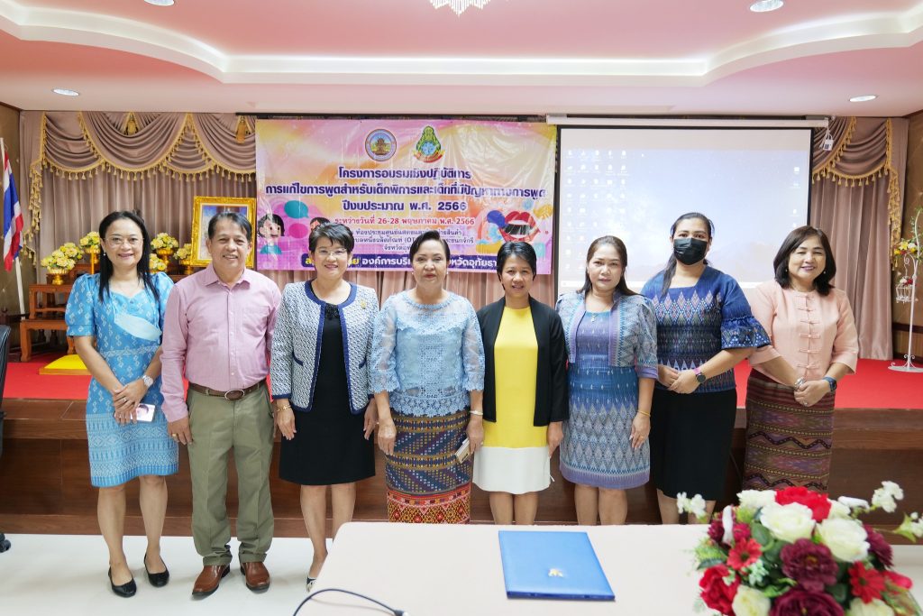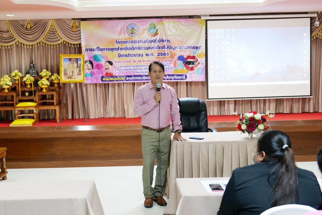 วันนี้ (26 พฤษภาคม 2566) เวลา 09.00 น. ณ ห้องประชุมศูนย์แสดงและจำหน่ายสินค้าหนึ่งตำบลหนึ่งผลิตภัณฑ์(OTOP) เมืองพระชนกจักรี นางไพรลิน นุ้ยปรี ที่ปรึกษานายกองค์การบริหารส่วนจังหวัดอุทัยธานี ปฏิบัติราชการแทนนายกองค์การบริหารส่วนจังหวัดอุทัยธานี เป็นประธานเปิดการอบรมเชิงปฏิบัติการการแก้ไขปัญหาการพูดสำหรับเด็กพิการและเด็กที่มีปัญหาทางการพูด ประจำปีงบประมาณ พ.ศ. 2566 โดยมีนางสาวสุจินดา มานักฆ้อง รองผู้อำนวยการศูนย์การศึกษาพิเศษประจำจังหวัดอุทัยธานี กล่าวรายงานฯ การอบรมในครั้งนี้ได้รับเกียรติจากคณะวิทยากรจากมหาวิทยาลัยศรีนคริทรวิโรฒ มาถ่ายทอดความรู้ โดยมีวัตถุประสงค์เพื่อให้ครูการศึกษาพิเศษ ครูผู้สอนในศูนย์พัฒนาเด็กเล็ก ครูผู้สอนในระดับชั้นอนุบาล และผู้ปกครองเด็กที่มีปัญหา ในจังหวัดอุทัยธานี ได้มีความรู้ ความสามารถปฏิบัติการการฝึกพูด/ แก้ไขปัญหาการพูดสำหรับเด็กพิการและเด็กที่มีปัญหาทางการพูดได้อย่างมีประสิทธิภาพ โดยทำการฝึกอบรมระหว่างวันที่ 26-28 พฤษภาคม 2566