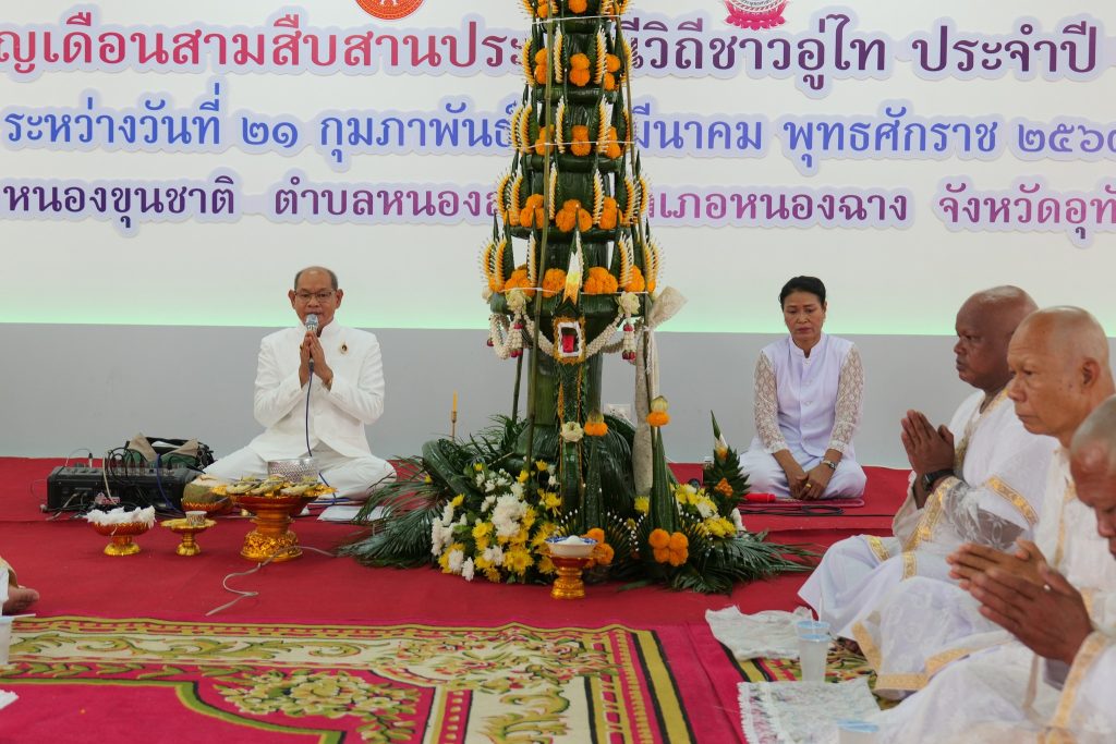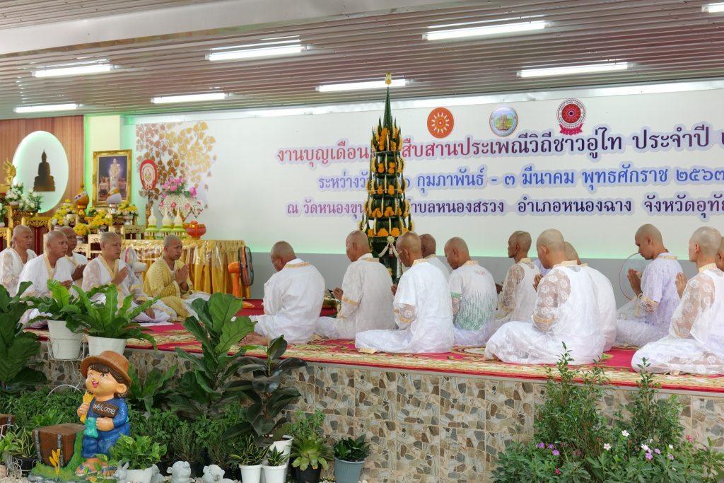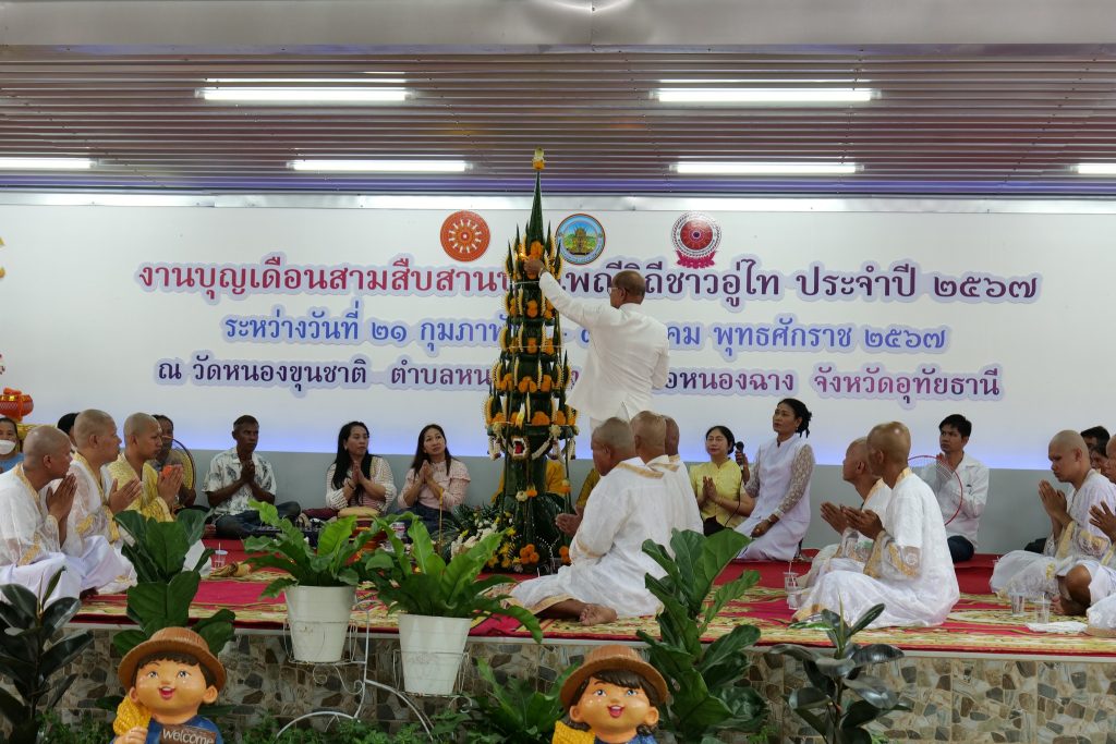 จากนั้นเวลา 13.00 น. พระราชอุทัยโสภณ เจ้าคณะจังหวัดอุทัยธานี เป็นประธานฝ่ายสงฆ์ นายธีรพัฒน์ คัชมาตย์ ผู้ว่าราชการจังหวัดอุทัยธานี เป็นประธานฝ่ายฆราวาสในงานพิธีทำขวัญนาค อุปสมบทนาคหมู่ เฉลิมพระเกียรติพระบาทสมเด็จพระเจ้าอยู่หัว เนื่องในโอกาสมหามงคลเฉลิมพระชนมพรรษา 6 รอบ 28 กรกฎาคม 2567 งานบุญเดือนสาม สืบสานประเพณีวิถีชาวอู่ไท ประจำปี 2567 โดยมี นายเผด็จ นุ้ยปรี นายกองค์การบริหารส่วนจังหวัดอุทัยธานี นายวิฑูรย์ สิรินุกุล รองผู้ว่าราชการจังหวัดอุทัยธานี พล.ต.ต. ณรงค์เดชศ์ ศักดิ์สมบูรณ์ ผู้บังคับการตำรวจภูธรจังหวัดอุทัยธานี ส่วนราชการ และประชาชน เข้าร่วมพิธี