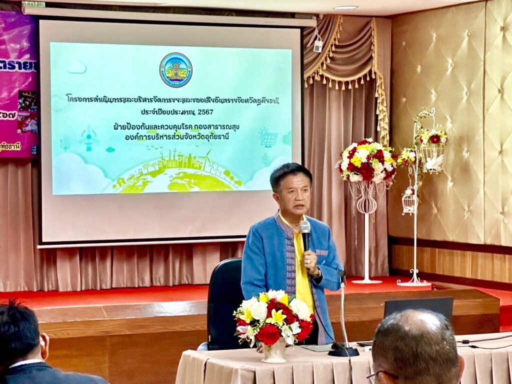 วันที่ 28 พฤษภาคม 2567 เวลา 09.00 น. ณ ศูนย์แสดงสินค้าหนึ่งตำบลหนึ่งผลิตภัณฑ์ (OTOP) เมืองพระชนกจักรี นายเผด็จ นุ้ยปรี เป็นประธานพิธีเปิดกิจกรรมฝึกอบรมให้ความรู้ด้านการจัดการของเสียอันตรายชุมชนสำหรับผู้ปฏิบัติงาน ตามโครงการดำเนินการและบริหารจัดการขยะมูลฝอยและของเสียอันตรายจังหวัดอุทัยธานี ประจำปีงบประมาณ พ.ศ.2567 จัดโดยกองสาธารณสุข องค์การบริหารส่วนจังหวัดอุทัยธานี ร่วมกับองค์กรปกครองส่วนท้องถิ่นในจังหวัดอุทัยธานี 63 แห่ง โดยมีนายชรินทร์ ไชยะ ปลัดองค์การบริหารส่วนจังหวัดอุทัยธานี กล่าวรายงานฯ มีนายธีรรัตน์ วงษ์จักร ท้องถิ่นจังหวัดอุทัยธานี ผู้อำนวยการสำนักทรัพยากรธรรมชาติและสิ่งแวดล้อมจังหวัดอุทัยธานี รองนายกองค์การบริหารส่วนจังหวัดอุทัยธานี เลขานุการนายก สมาชิกสภาองค์การบริหารส่วนจังหวัดอุทัยธานี เจ้าหน้าที่กองสาธารณสุข โดยมีผู้เข้าร่วมกิจกรรมจำนวน 90 คน