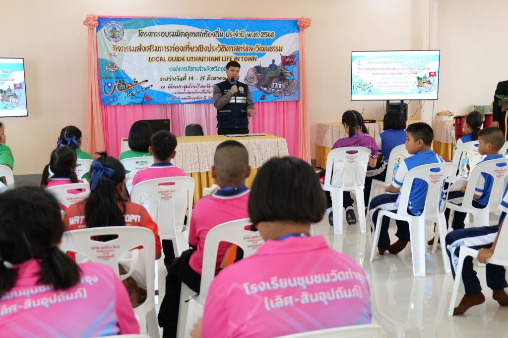วันนี้(14 สิงหาคม 2568) เวลา 09.00 น. ณ ห้องประชุมโรงเรียนวัดสังกัสรัตนคีรี อำเภอเมืองฯ จังหวัดอุทัยธานี นายตริณณุพล นุ้ยปรี รองนายกองค์การบริหารส่วนจังหวัดอุทัยธานี เป็นประธานเปิดโครงการอบรมมัคคุเทศก์ท้องถิ่น ประจำปี 2568 โดยมีนายจักรกฤษณ์ หาญกลับ หัวหน้าสำนักปลัดองค์การบริหารส่วนจังหวัด กล่าววัตถุประสงค์ฯ การจัดโครงการในครั้งนี้มีวัตถุประสงค์เพื่อให้เด็กนักเรียนในพื้นที่รับบทบาทเป็นเจ้าบ้านที่ดี ต้อนรับนักท่องเที่ยวที่เข้ามาท่องเที่ยวในตัวเมืองอุทัยธานี ตามสถานที่ท่องเที่ยวต่างๆ เช่น ศาลเจ้าปุงเถ่ากง ทางเดินริมน้ำแม่น้ำสะแกกรัง วัดอุโปสถาราม(วัดโบสถ์) ตรอกโรงยา วงเวียนช้าง และช้างปิงพื้นที่ท่องเที่ยวสร้างสรรค์ โดยมีนักเรียนร่วมกิจกรรมจากโรงเรียนวัดสังกัสรัตนคีรี โรงเรียนวัดหนองตางู โรงเรียนชุมชนวัดท่าซุง โรงเรียนเทศบาลวัดธรรมโศภิต และโรงเรียนวัดอุโปสถาราม มีนักเรียนเข้าร่วมกิจกรรมจำนวน 50 คน โดยมีวิทยากรร่วมบรรยายให้ความรู้ถึงประวัติ และจุดเด่นของสถานที่ท่องเที่ยวต่างๆ อย่างเป็นกันเองกับน้องๆ นักเรียน