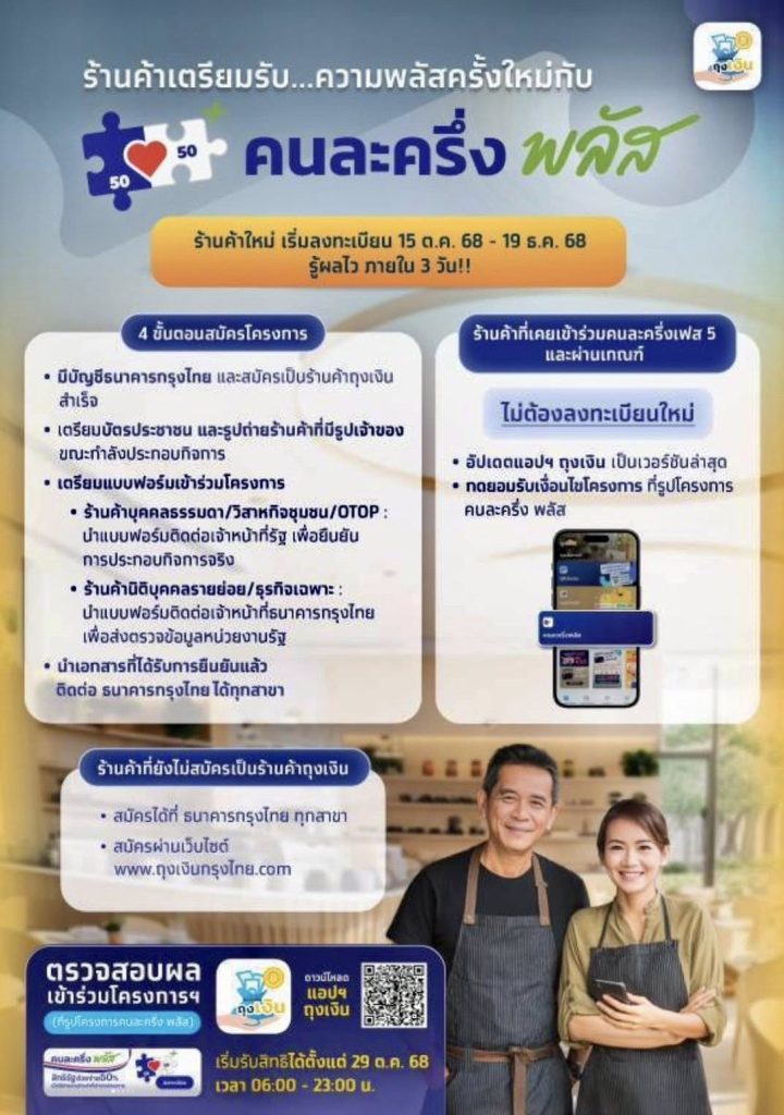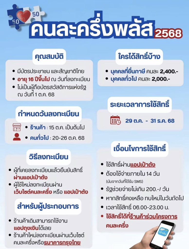 ข่าวประชาสัมพันธ์, ภาพกิจกรรม อบจ.ประชาสัมพันธ์การลงทะเบียนเข้าร่วมโครงการ “คนละครึ่ง พลัส” ผ่านแอป เป๋าตัง Posted on 17 ตุลาคม 256817 ตุลาคม 2025 by yammy ลงทะเบียนสิทธิ: 20 – 26 ตุลาคม 2568 เริ่มใช้สิทธิ: 29 ตุลาคม – 31 ธันวาคม 2568