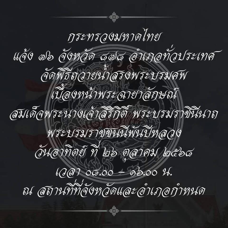 📢 ตามที่กระทรวงมหาดไทยแจ้งทุกจังหวัด และอำเภอทั่วประเทศ จัดพิธีถวายน้ำสรงพระบรมศพ เบื้องหน้าพระฉายาลักษณ์ สมเด็จพระนางเจ้าสิริกิติ์ พระบรมราชินีนาถ พระบรมราชชนนีพันปีหลวง เพื่อให้ประชาชนทุกหมู่เหล่าได้มีส่วนร่วมในการแสดงความไว้อาลัยถวายสมเด็จพระนางเจ้าสิริกิติ์ พระบรมราชินีนาถ พระบรมราชชนนีพันปีหลวง โดย