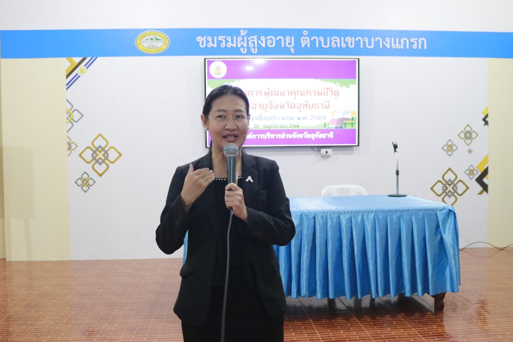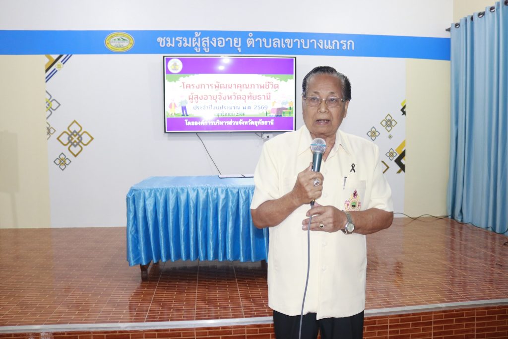 วันที่ 20 พฤศจิกายน 2568 ณ ชมรมผู้สูงอายุเขาบางแกรก ตำบลเขาบางแกรก อำเภอหนองฉาง จังหวัดอุทัยธานี นายตริณณุพล นุ้ยปรี รองนายกองค์การบริหารส่วนจังหวัดอุทัยธานีเป็นประธานเปิดงานโครงการพัฒนาคุณภาพชีวิตผู้สูงอายุจังหวัดอุทัยธานี ประจำปีงบประมาณ พ.ศ.2569 (กิจกรรมที่ 1 ครั้งที่ 1 กิจกรรมการทำขนมเปี๊ยะชาววัง) โดยมีนายชรินทร์ ไชยะ ปลัดองค์การบริหารส่วนจังหวัดอุทัยธานีกล่าวรายงานวัตถุประสงค์ของโครงการฯ การจัดกิจกรรมในครั้งนี้ ได้รับเกียรติจาก นางสาวอมรศรี รัศมิทัต พัฒนาสังคมและความมั่นคงของมนุษย์จังหวัดอุทัยธานี นายอภิชาต โตคำ ประธานสาขาสมาคมผู้สูงอายุแห่งประเทศไทย ประจำจังหวัดอุทัยธานี นายสมชาย นพรัตน์ สมาชิกสภาองค์การบริหารส่วนจังหวัดอุทัยธานี เขต 2 อำเภอหนองฉาง นายจักรกฤษณ์ หาญกลับ หัวหน้าสำนักปลัดองค์การบริหารส่วนจังหวัด ซึ่งการจัดโครงการนี้มุ่งการส่งเสริมและพัฒนาคุณภาพชีวิตให้แก่ผู้สูงอายุ ให้มีสุขภาพจิตที่ดี มีความสุข และใช้เวลาว่างให้เกิดประโยชน์ สามารถนำความรู้ที่ได้สร้างรายได้เสริม โดยวิทยากรจากศูนย์วงเดือน อาคมสุรทัณฑ์ เป็นผู้ถ่ายทอดความรู้ในครั้งนี้