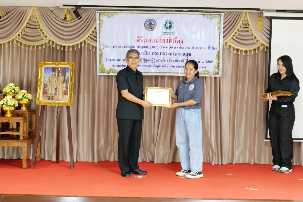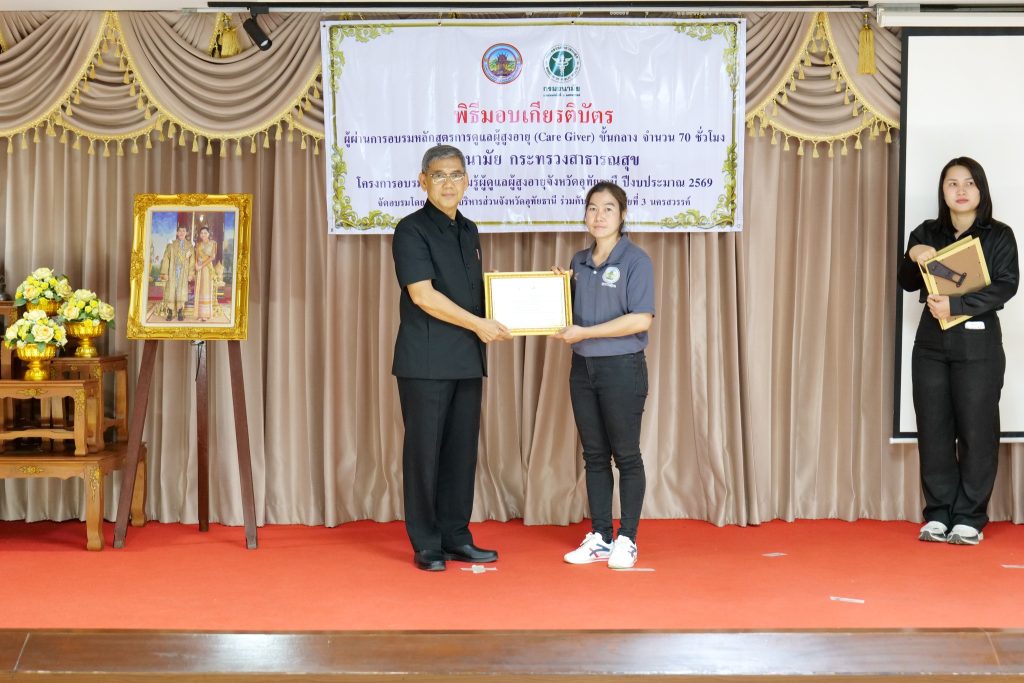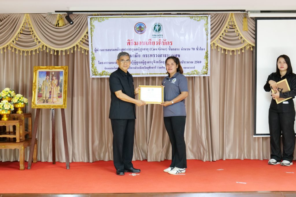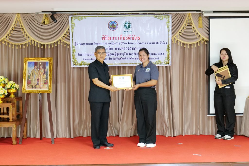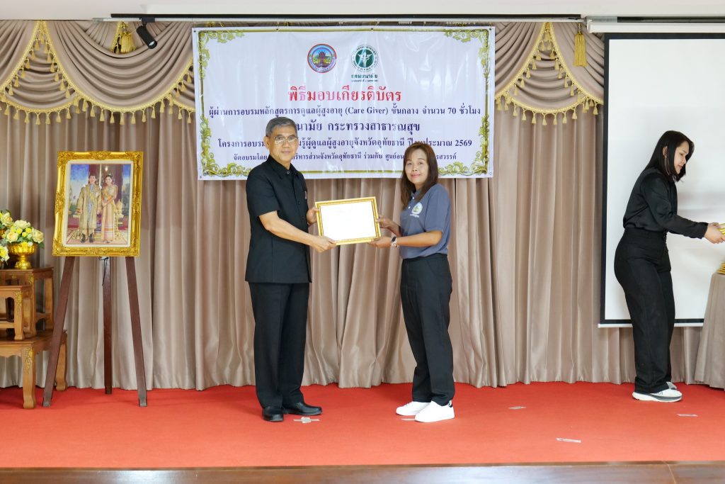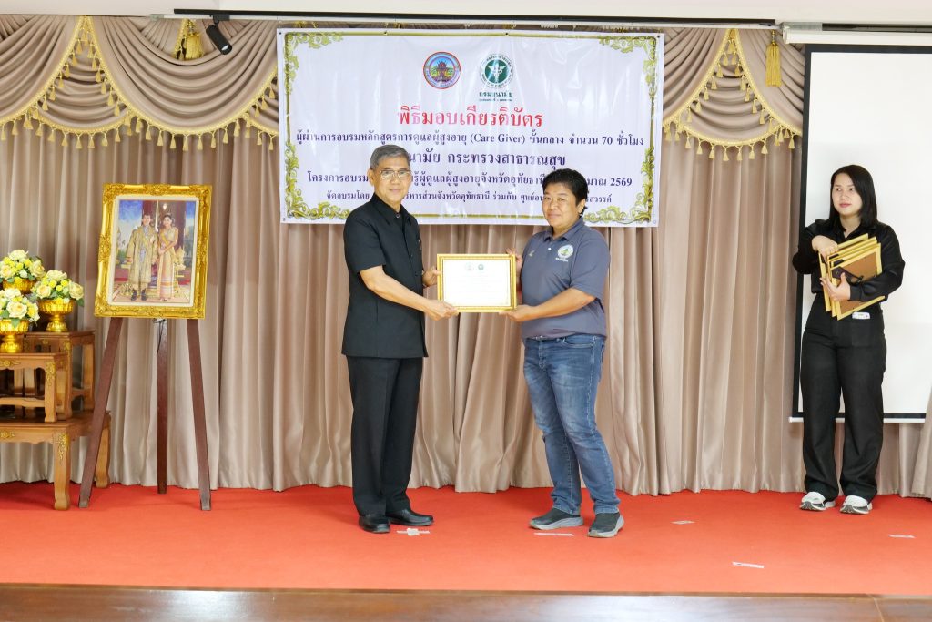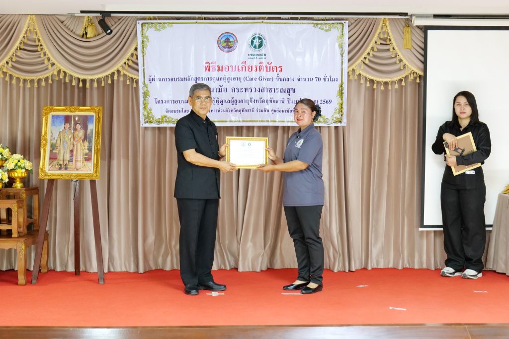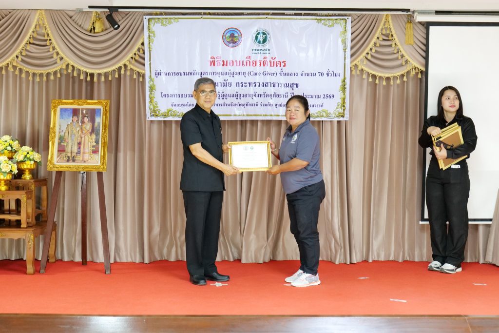 วันที่ 7 มกราคม 2569 เวลา 10.00 น. นายนิวัฒน์ ภาตะนันท์ รองนายกองค์การบริหารส่วนจังหวัดอุทัยธานี เป็นประธานในพิธีมอบเกียรติบัตรให้แก่ผู้ผ่านการอบรมหลักสูตรผู้ดูแลผู้สูงอายุจังหวัดอุทัยธานี (Care Giver) ของกรมอนามัย กระทรวงสาธารณสุข โดยกองสาธารณสุข องค์การบริหารส่วนจังหวัดอุทัยธานี ร่วมกับศูนย์อนามัยที่ 3 นครสวรรค์ ประจำปี 2569 โดยมีนายชรินทร์ ไชยะ ปลัดองค์การบริหารส่วนจังหวัดอุทัยธานี กล่าวสรุปผลการดำเนินการโครงการฯ ซึ่งการอบรมในครั้งนี้มีผู้เข้ารับการอบรมฯ จาก 8 อำเภอ จำนวน 51 คน ณ ห้องประชุมทานตะวัน ศูนย์แสดงและจำหน่ายสินค้าหนึ่งตำบล หนึ่งผลิตภัณฑ์ (OTOP) เมืองพระชนกจักรี โดยมีผู้บริหารจาก สปสช. สสจ.อุทัยธานี และหน่วยงานที่เกี่ยวข้องร่วมในพิธีฯ