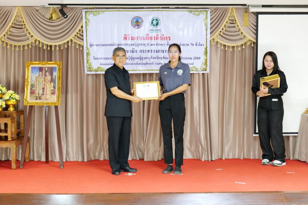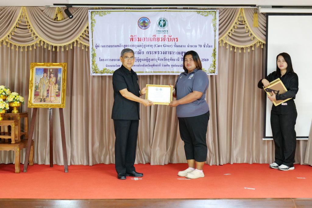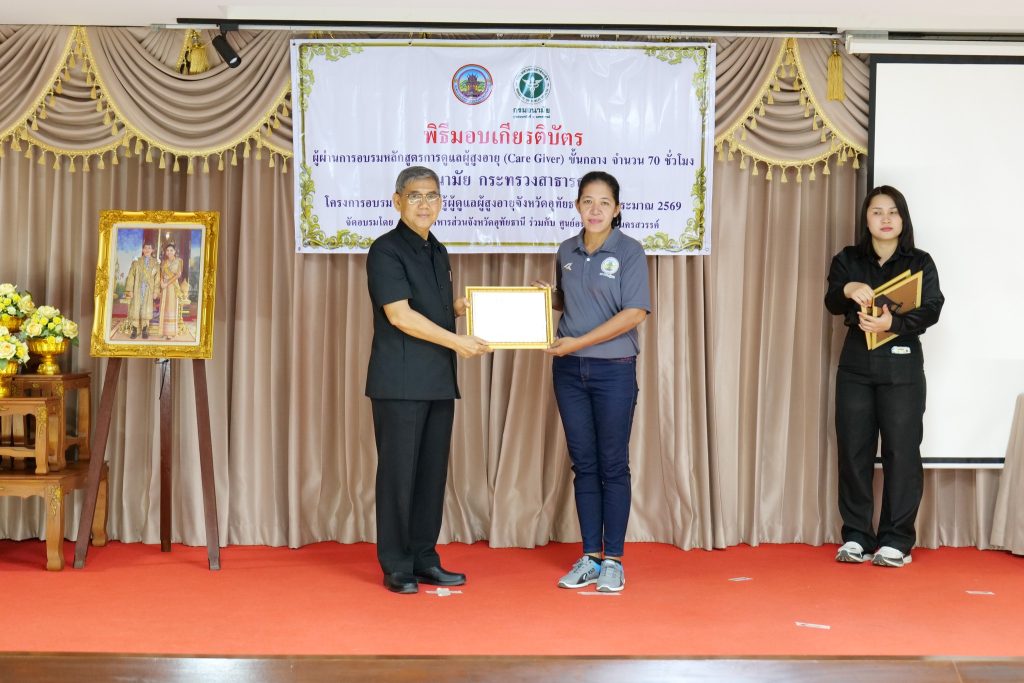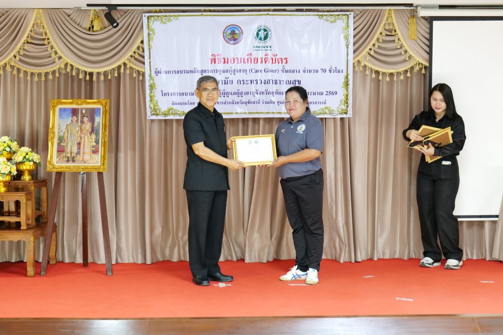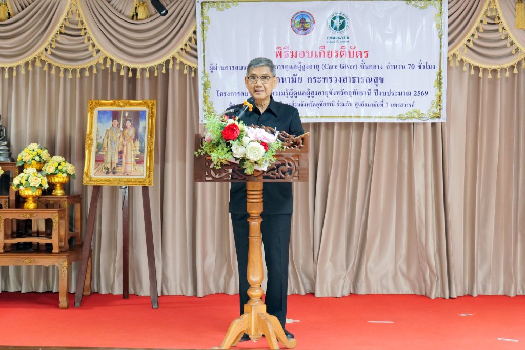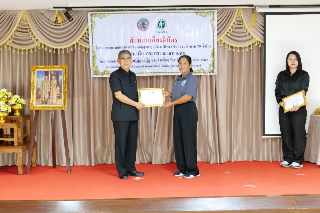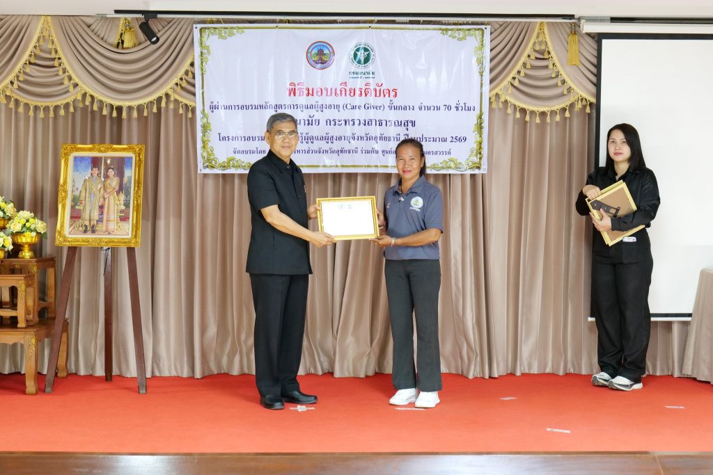 วันที่ 7 มกราคม 2569 เวลา 10.00 น. นายนิวัฒน์ ภาตะนันท์ รองนายกองค์การบริหารส่วนจังหวัดอุทัยธานี เป็นประธานในพิธีมอบเกียรติบัตรให้แก่ผู้ผ่านการอบรมหลักสูตรผู้ดูแลผู้สูงอายุจังหวัดอุทัยธานี (Care Giver) ของกรมอนามัย กระทรวงสาธารณสุข โดยกองสาธารณสุข องค์การบริหารส่วนจังหวัดอุทัยธานี ร่วมกับศูนย์อนามัยที่ 3 นครสวรรค์ ประจำปี 2569 โดยมีนายชรินทร์ ไชยะ ปลัดองค์การบริหารส่วนจังหวัดอุทัยธานี กล่าวสรุปผลการดำเนินการโครงการฯ ซึ่งการอบรมในครั้งนี้มีผู้เข้ารับการอบรมฯ จาก 8 อำเภอ จำนวน 51 คน ณ ห้องประชุมทานตะวัน ศูนย์แสดงและจำหน่ายสินค้าหนึ่งตำบล หนึ่งผลิตภัณฑ์ (OTOP) เมืองพระชนกจักรี โดยมีผู้บริหารจาก สปสช. สสจ.อุทัยธานี และหน่วยงานที่เกี่ยวข้องร่วมในพิธีฯ