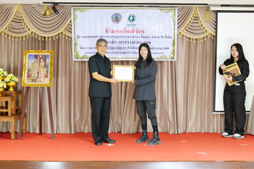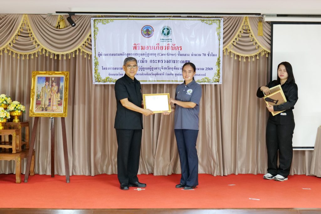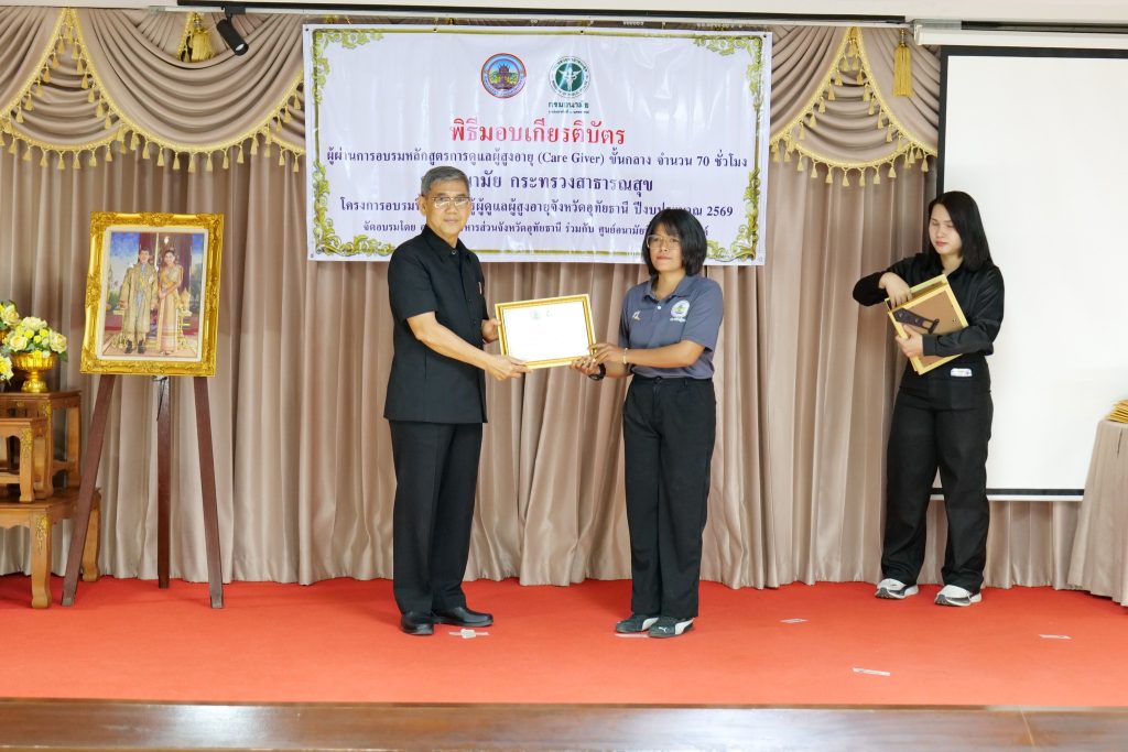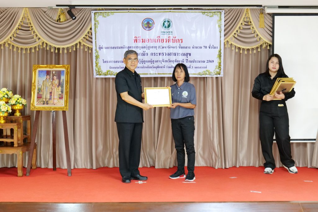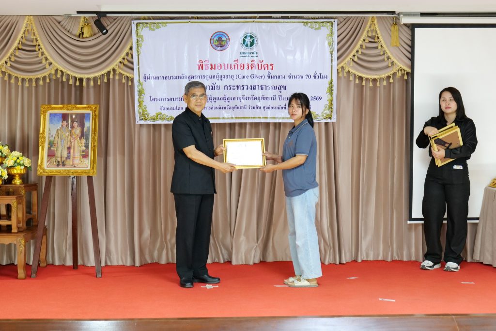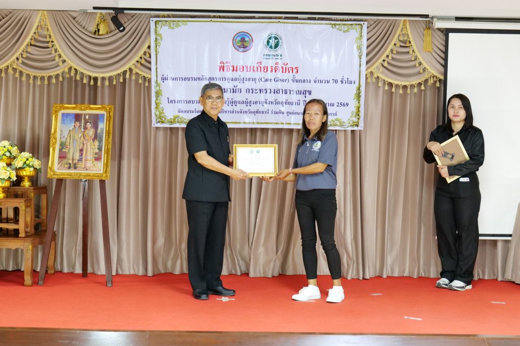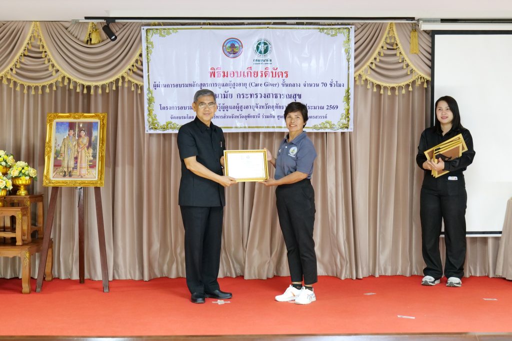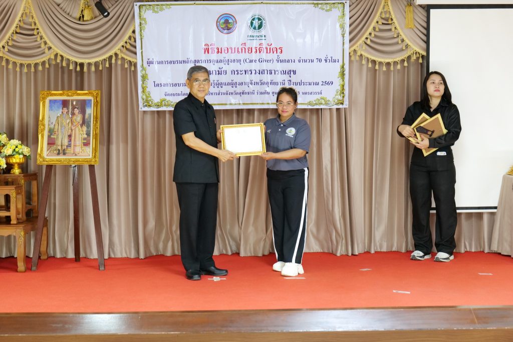 วันที่ 7 มกราคม 2569 เวลา 10.00 น. นายนิวัฒน์ ภาตะนันท์ รองนายกองค์การบริหารส่วนจังหวัดอุทัยธานี เป็นประธานในพิธีมอบเกียรติบัตรให้แก่ผู้ผ่านการอบรมหลักสูตรผู้ดูแลผู้สูงอายุจังหวัดอุทัยธานี (Care Giver) ของกรมอนามัย กระทรวงสาธารณสุข โดยกองสาธารณสุข องค์การบริหารส่วนจังหวัดอุทัยธานี ร่วมกับศูนย์อนามัยที่ 3 นครสวรรค์ ประจำปี 2569 โดยมีนายชรินทร์ ไชยะ ปลัดองค์การบริหารส่วนจังหวัดอุทัยธานี กล่าวสรุปผลการดำเนินการโครงการฯ ซึ่งการอบรมในครั้งนี้มีผู้เข้ารับการอบรมฯ จาก 8 อำเภอ จำนวน 51 คน ณ ห้องประชุมทานตะวัน ศูนย์แสดงและจำหน่ายสินค้าหนึ่งตำบล หนึ่งผลิตภัณฑ์ (OTOP) เมืองพระชนกจักรี โดยมีผู้บริหารจาก สปสช. สสจ.อุทัยธานี และหน่วยงานที่เกี่ยวข้องร่วมในพิธีฯ