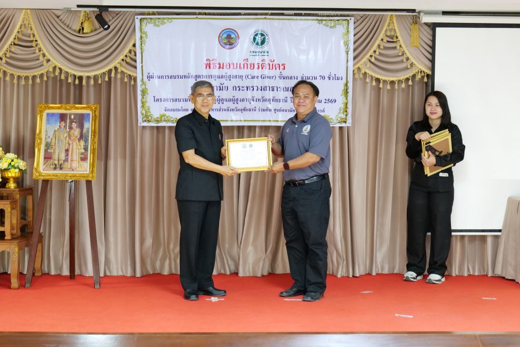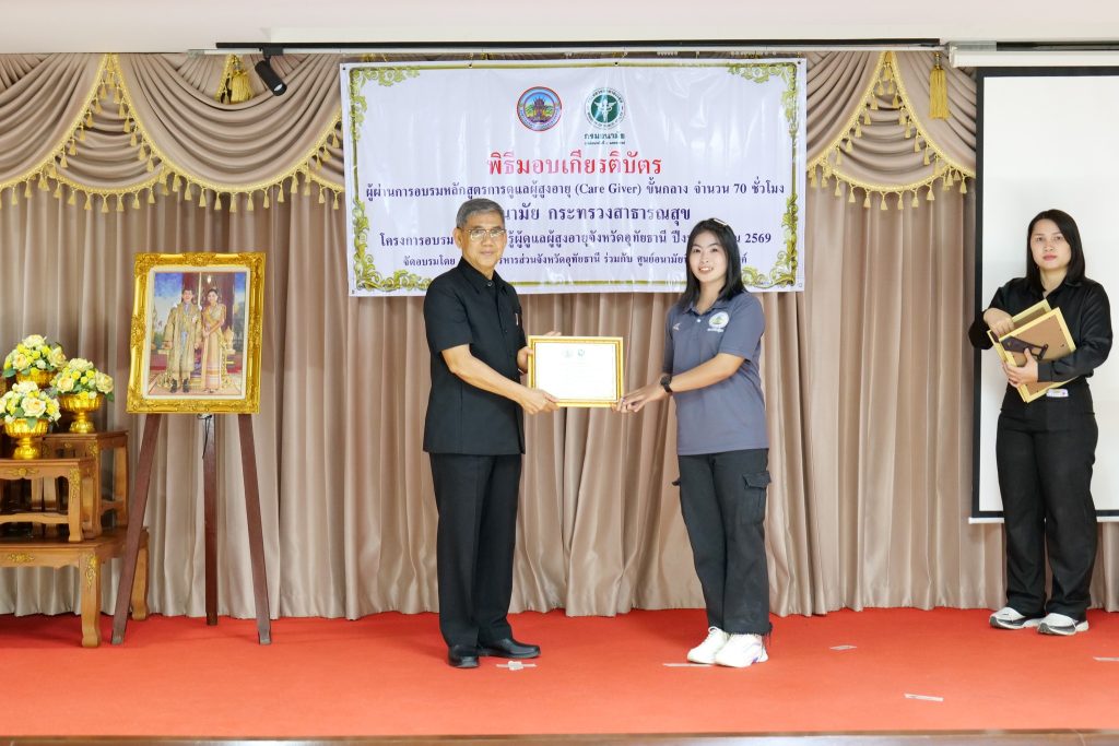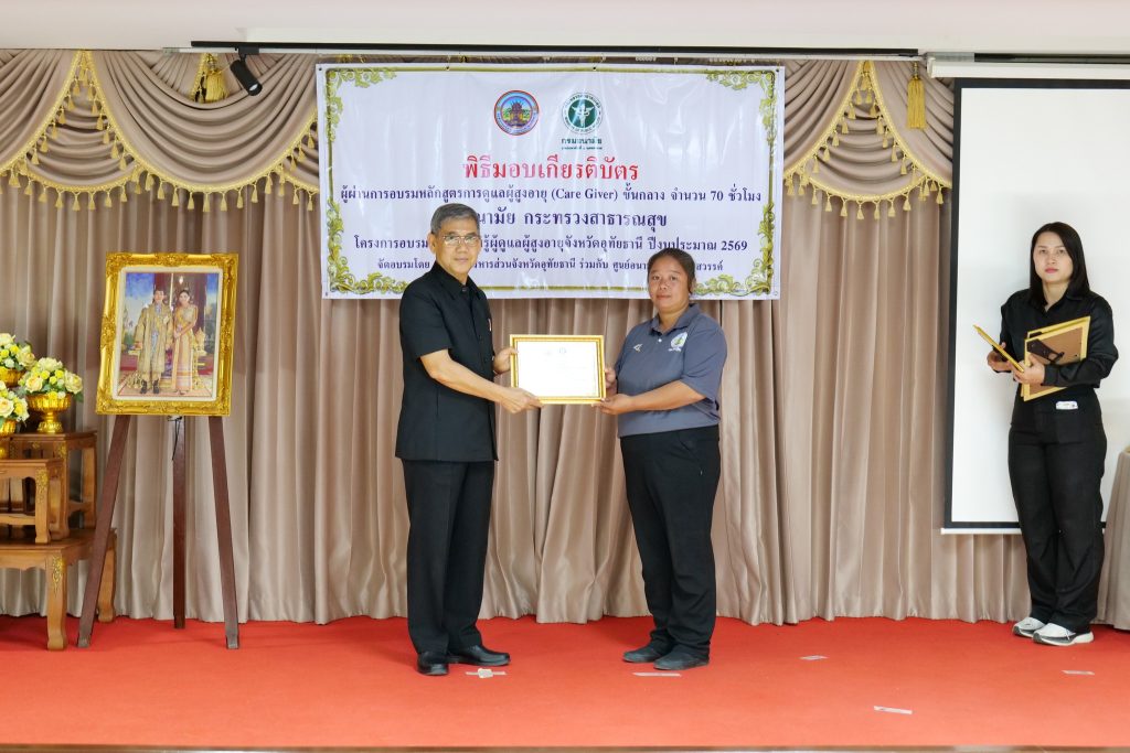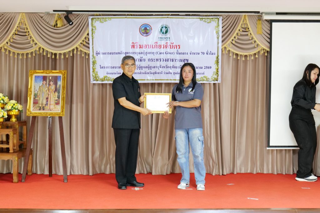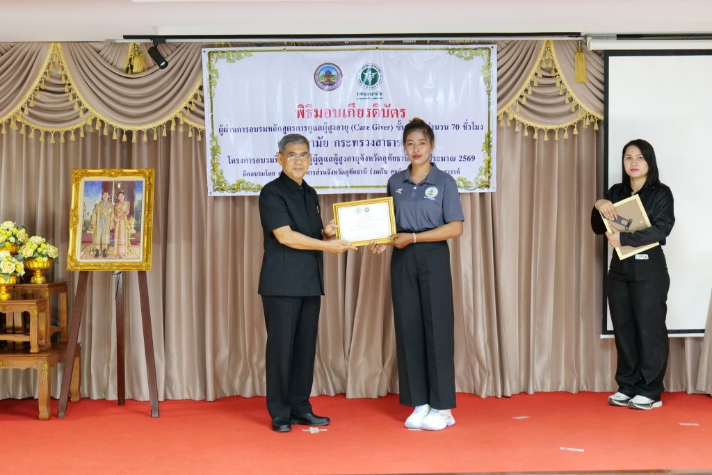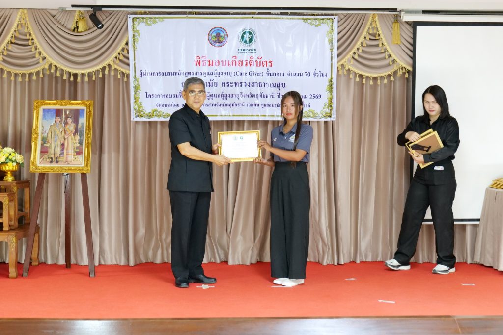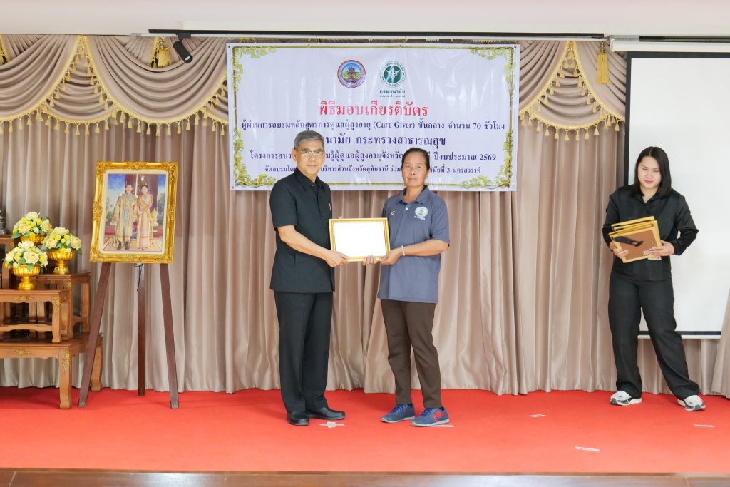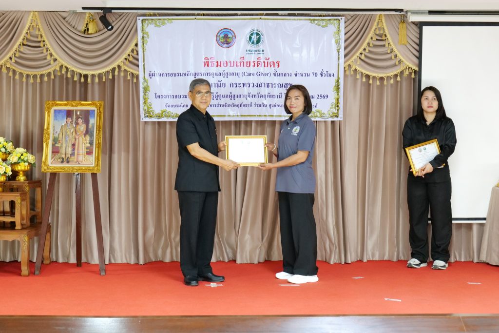 วันที่ 7 มกราคม 2569 เวลา 10.00 น. นายนิวัฒน์ ภาตะนันท์ รองนายกองค์การบริหารส่วนจังหวัดอุทัยธานี เป็นประธานในพิธีมอบเกียรติบัตรให้แก่ผู้ผ่านการอบรมหลักสูตรผู้ดูแลผู้สูงอายุจังหวัดอุทัยธานี (Care Giver) ของกรมอนามัย กระทรวงสาธารณสุข โดยกองสาธารณสุข องค์การบริหารส่วนจังหวัดอุทัยธานี ร่วมกับศูนย์อนามัยที่ 3 นครสวรรค์ ประจำปี 2569 โดยมีนายชรินทร์ ไชยะ ปลัดองค์การบริหารส่วนจังหวัดอุทัยธานี กล่าวสรุปผลการดำเนินการโครงการฯ ซึ่งการอบรมในครั้งนี้มีผู้เข้ารับการอบรมฯ จาก 8 อำเภอ จำนวน 51 คน ณ ห้องประชุมทานตะวัน ศูนย์แสดงและจำหน่ายสินค้าหนึ่งตำบล หนึ่งผลิตภัณฑ์ (OTOP) เมืองพระชนกจักรี โดยมีผู้บริหารจาก สปสช. สสจ.อุทัยธานี และหน่วยงานที่เกี่ยวข้องร่วมในพิธีฯ
