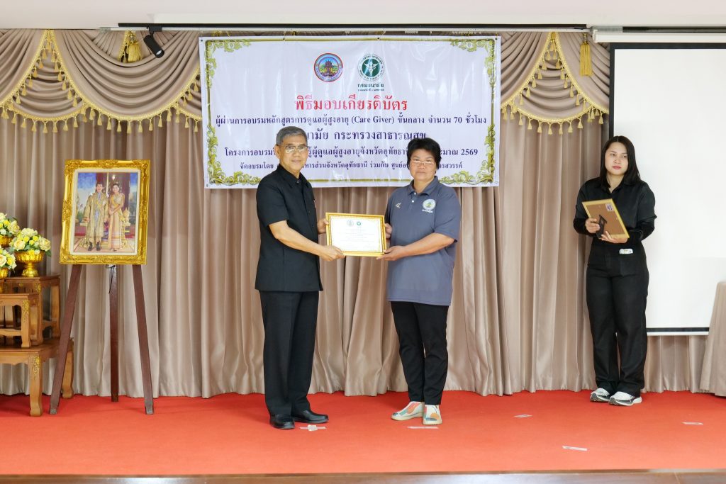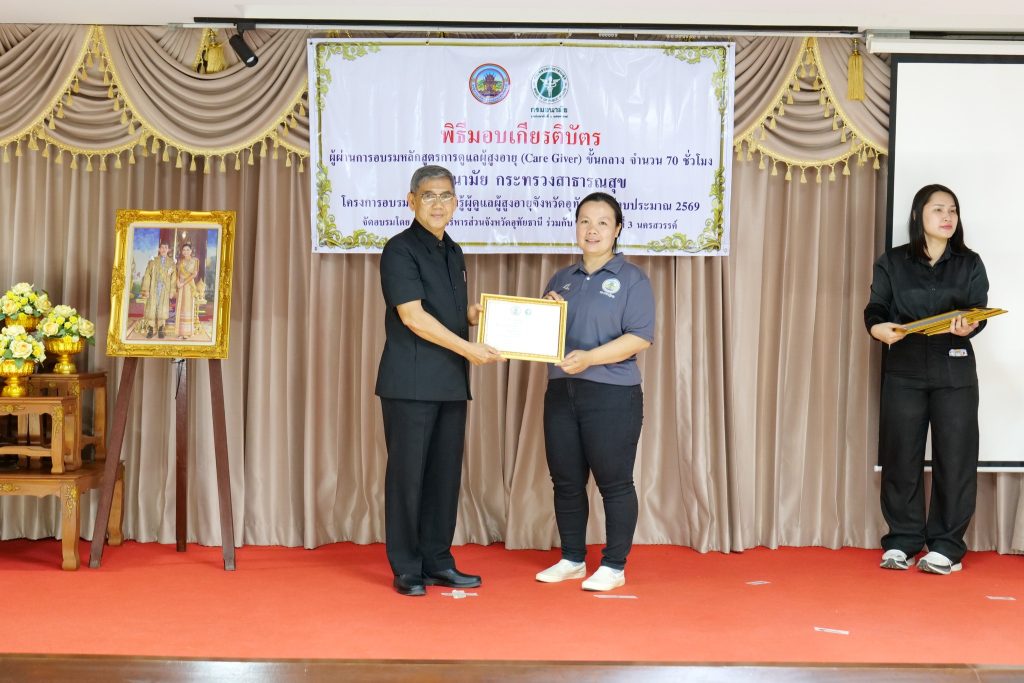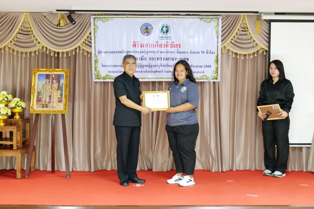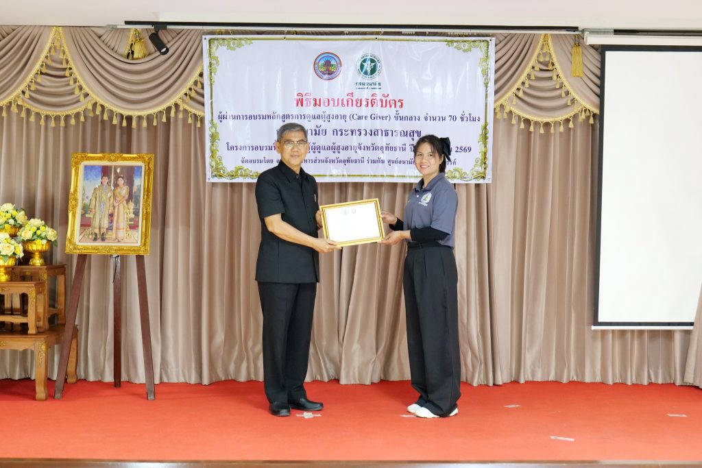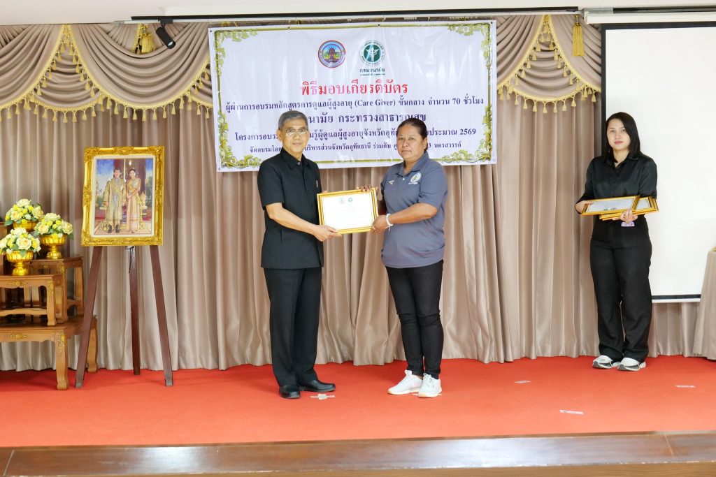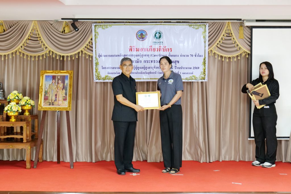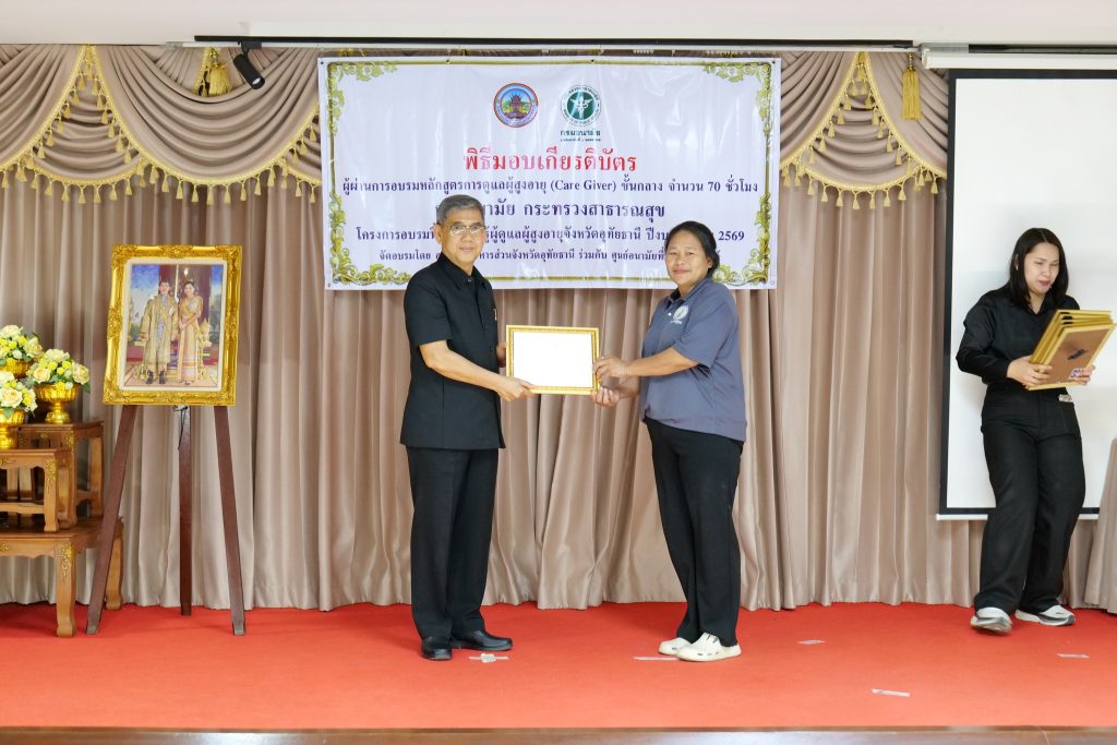 วันที่ 7 มกราคม 2569 เวลา 10.00 น. นายนิวัฒน์ ภาตะนันท์ รองนายกองค์การบริหารส่วนจังหวัดอุทัยธานี เป็นประธานในพิธีมอบเกียรติบัตรให้แก่ผู้ผ่านการอบรมหลักสูตรผู้ดูแลผู้สูงอายุจังหวัดอุทัยธานี (Care Giver) ของกรมอนามัย กระทรวงสาธารณสุข โดยกองสาธารณสุข องค์การบริหารส่วนจังหวัดอุทัยธานี ร่วมกับศูนย์อนามัยที่ 3 นครสวรรค์ ประจำปี 2569 โดยมีนายชรินทร์ ไชยะ ปลัดองค์การบริหารส่วนจังหวัดอุทัยธานี กล่าวสรุปผลการดำเนินการโครงการฯ ซึ่งการอบรมในครั้งนี้มีผู้เข้ารับการอบรมฯ จาก 8 อำเภอ จำนวน 51 คน ณ ห้องประชุมทานตะวัน ศูนย์แสดงและจำหน่ายสินค้าหนึ่งตำบล หนึ่งผลิตภัณฑ์ (OTOP) เมืองพระชนกจักรี โดยมีผู้บริหารจาก สปสช. สสจ.อุทัยธานี และหน่วยงานที่เกี่ยวข้องร่วมในพิธีฯ