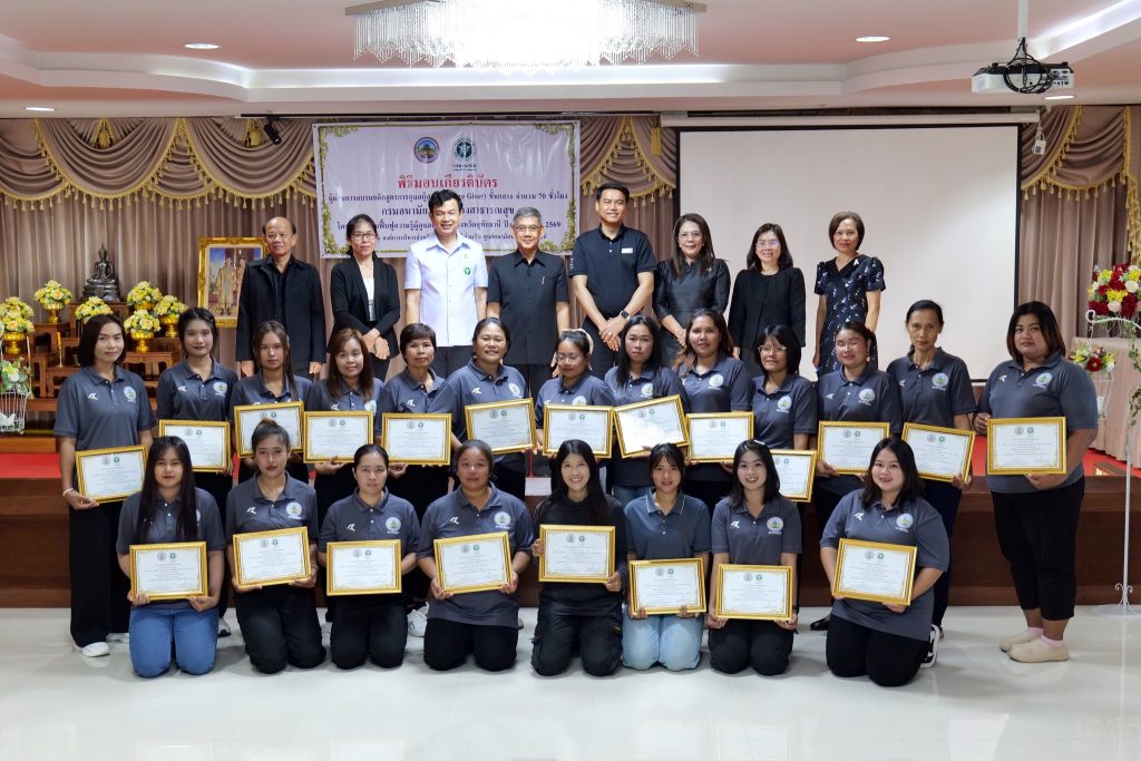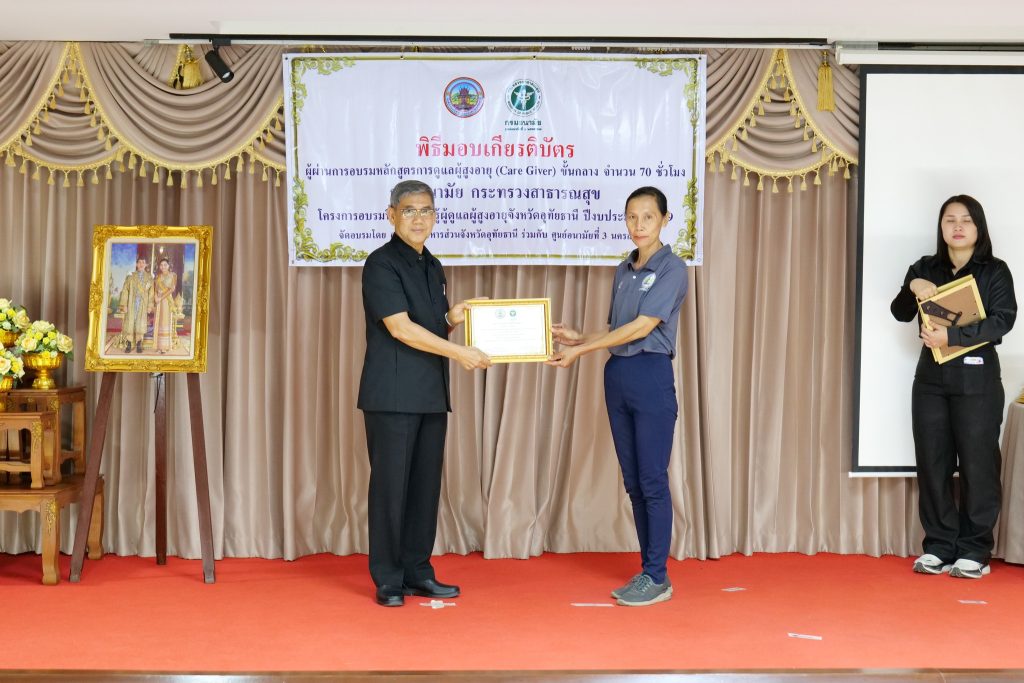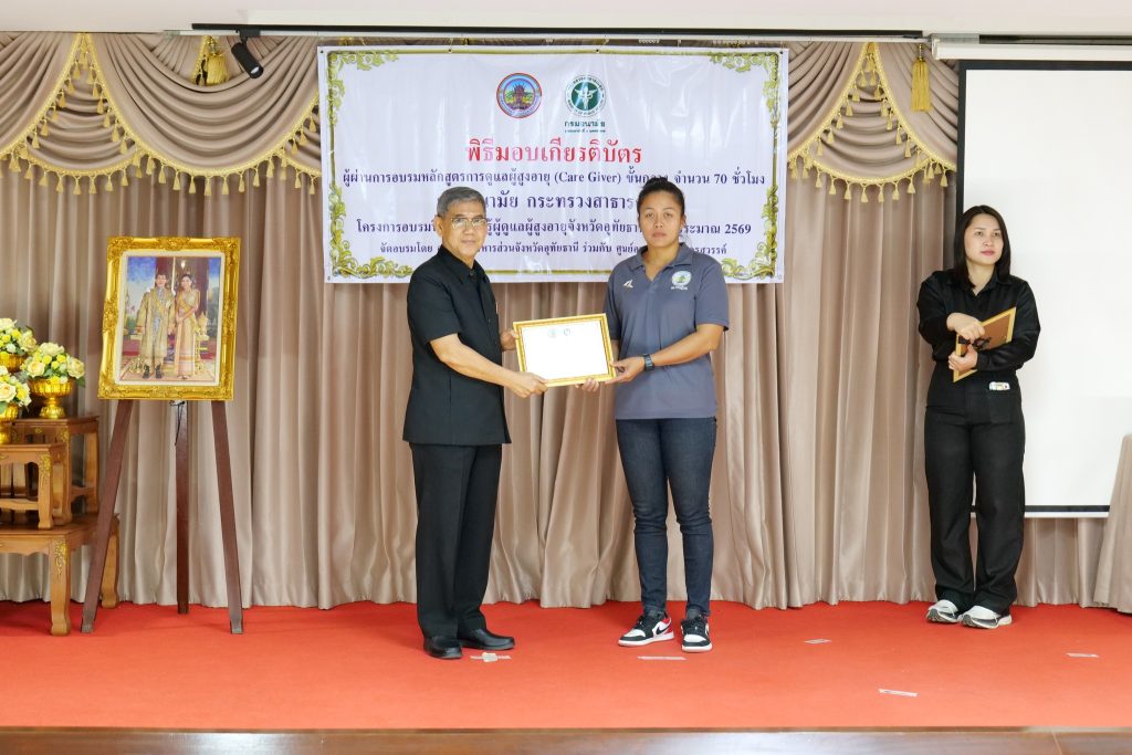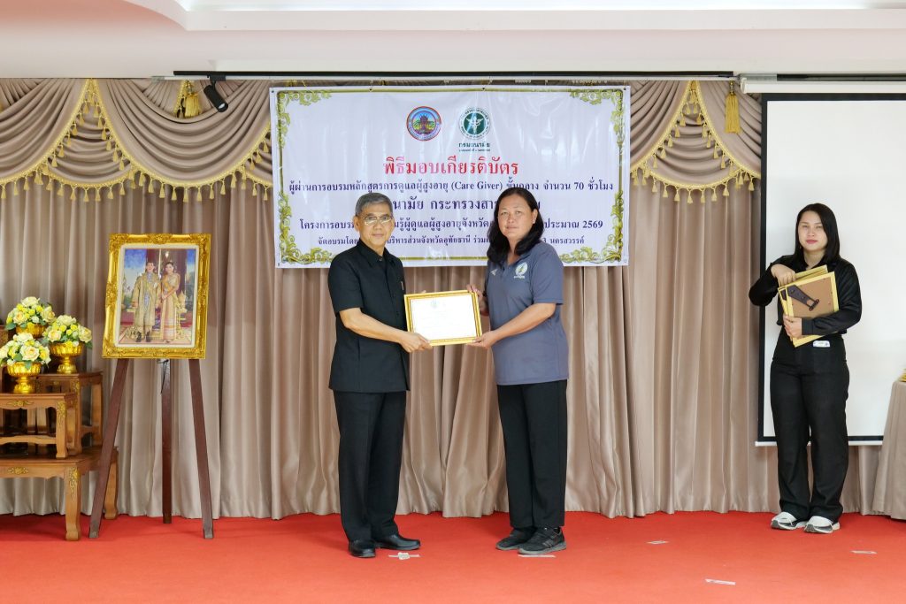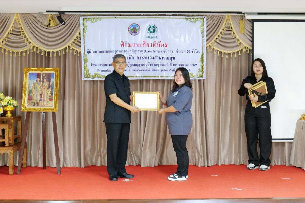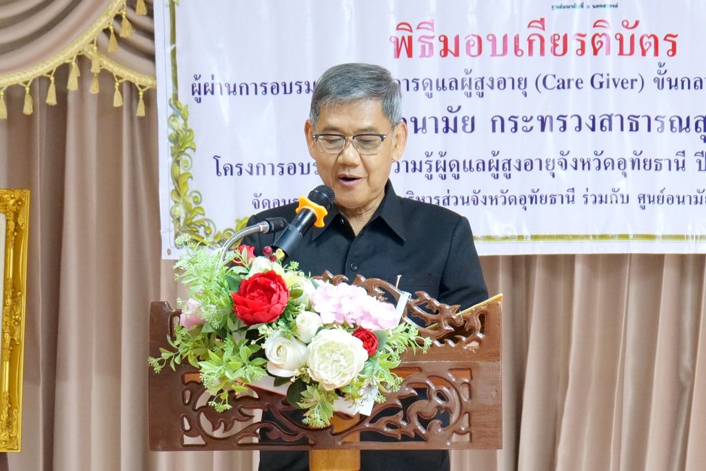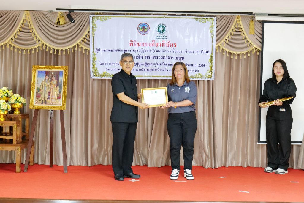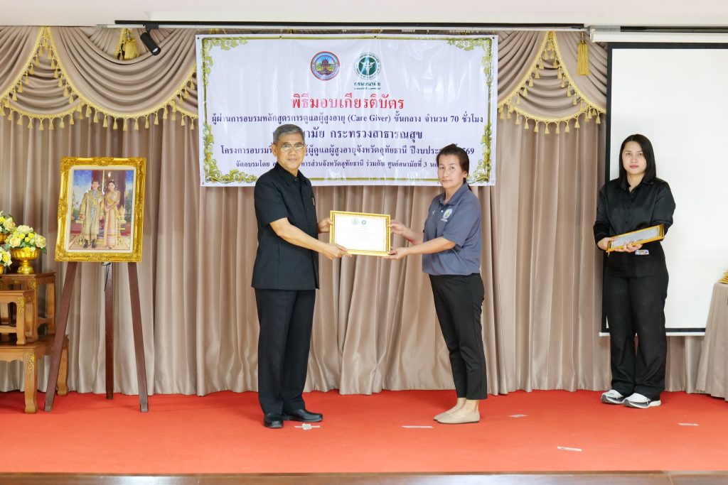 วันที่ 7 มกราคม 2569 เวลา 10.00 น. นายนิวัฒน์ ภาตะนันท์ รองนายกองค์การบริหารส่วนจังหวัดอุทัยธานี เป็นประธานในพิธีมอบเกียรติบัตรให้แก่ผู้ผ่านการอบรมหลักสูตรผู้ดูแลผู้สูงอายุจังหวัดอุทัยธานี (Care Giver) ของกรมอนามัย กระทรวงสาธารณสุข โดยกองสาธารณสุข องค์การบริหารส่วนจังหวัดอุทัยธานี ร่วมกับศูนย์อนามัยที่ 3 นครสวรรค์ ประจำปี 2569 โดยมีนายชรินทร์ ไชยะ ปลัดองค์การบริหารส่วนจังหวัดอุทัยธานี กล่าวสรุปผลการดำเนินการโครงการฯ ซึ่งการอบรมในครั้งนี้มีผู้เข้ารับการอบรมฯ จาก 8 อำเภอ จำนวน 51 คน ณ ห้องประชุมทานตะวัน ศูนย์แสดงและจำหน่ายสินค้าหนึ่งตำบล หนึ่งผลิตภัณฑ์ (OTOP) เมืองพระชนกจักรี โดยมีผู้บริหารจาก สปสช. สสจ.อุทัยธานี และหน่วยงานที่เกี่ยวข้องร่วมในพิธีฯ