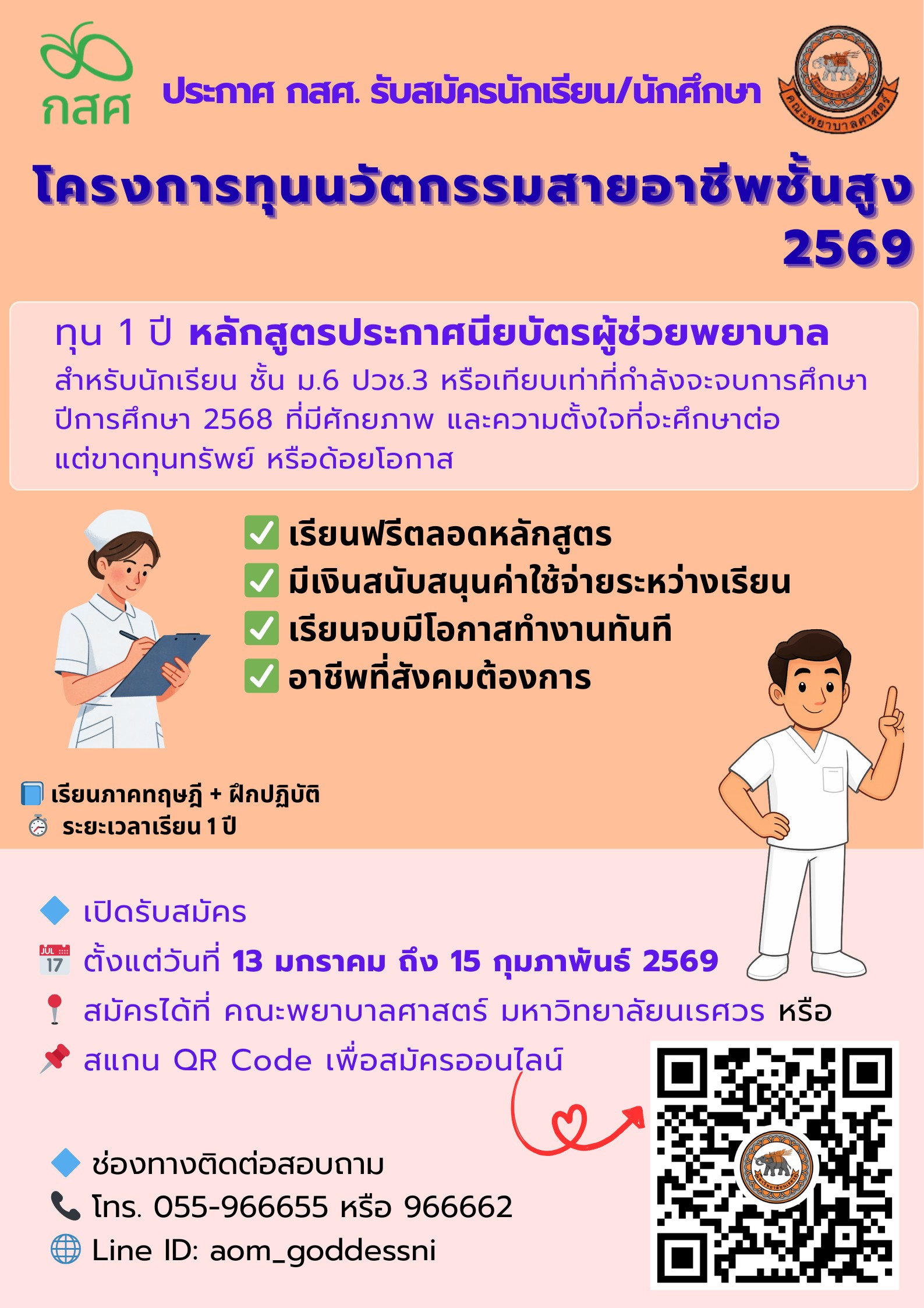 ด้วยคณะพยาบาลศาสตร์ มหาวิทยาลัยนเรศวร ได้รับการสนับสนุนทุนการศึกษาจากกองทุนเพื่อความเสมอภาคทางการศึกษา (กสศ.) สำหรับนักเรียนที่กำลังศึกษาในระดับชั้นมัธยมศึกษาปีที่ 6 หรือ ปวช. 3 หรือเทียบเท่า และคาดว่าจะสำเร็จการศึกษาในปีการศึกษา 2568 ซึ่งขาดแคลนทุนทรัพย์หรือเป็นผู้ด้อยโอกาส รวมถึงผู้ที่สำเร็จการศึกษาชั้นมัธยมศึกษาปีที่ 6 หรือ ปวช. 3 หรือเทียบเท่าในปีการศึกษา 2566 – 2567 ที่ได้รับการเสนอชื่อโดยคณะกรรมการขับเคลื่อนการแก้ไขปัญหาเด็กและเยาวชนนอกระบบการศึกษาให้กลายเป็นศูนย์ (Thailand Zero Dropout) ระดับจังหวัด ให้ได้รับการศึกษาในหลักสูตรประกาศนียบัตรผู้ช่วยพยาบาล (หลักสูตร 1 ปี) ประจำปีการศึกษา 2569 ที่คณะพยาบาลศาสตร์ มหาวิทยาลัยนเรศวร โดยผู้รับทุนจะได้รับการสนับสนุนค่าธรรมเนียมการศึกษา และค่าใช้จ่ายรายเดือนจนสำเร็จการศึกษา มีกำหนดการรับสมัครตั้งแต่บัดนี้ไปจนถึงวันที่ 15 กุมภาพันธ์ 2569