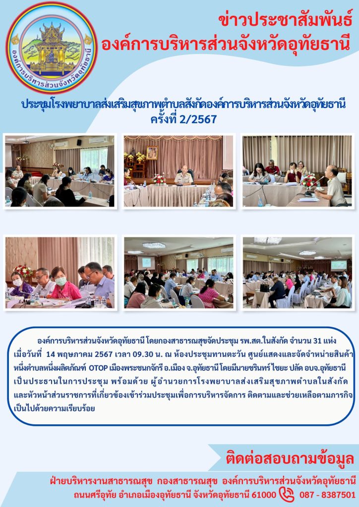 องค์การบริหารส่วนจังหวัดอุทัยธานี โดยกองสาธารณสุขจัดประชุม รพ.สต.ในสังกัด จำนวน 31 แห่ง ณ ห้องประชุมทานตะวัน ศูนย์แสดงและจัดจำหน่ายสินค้าหนึ่งตำบลหนึ่งผลิตภัณฑ์ OTOP เมืองพระชนกจักรี อ.เมือง จ.อุทัยธานี โดยมีนายชรินทร์ ไชยะ ปลัด อบจ.อุทัยธานีเป็นประธานในการประชุม พร้อมด้วย ผู้อำนวยการโรงพยาบาลส่งเสริมสุขภาพตำบลในสังกัดและหัวหน้าส่วนราชการที่เกี่ยวข้องเข้าร่วมประชุมเพื่อการบริหารจัดการ ติดตามและช่วยเหลือตามภารกิจเป็นไปด้วยความเรียบร้อย